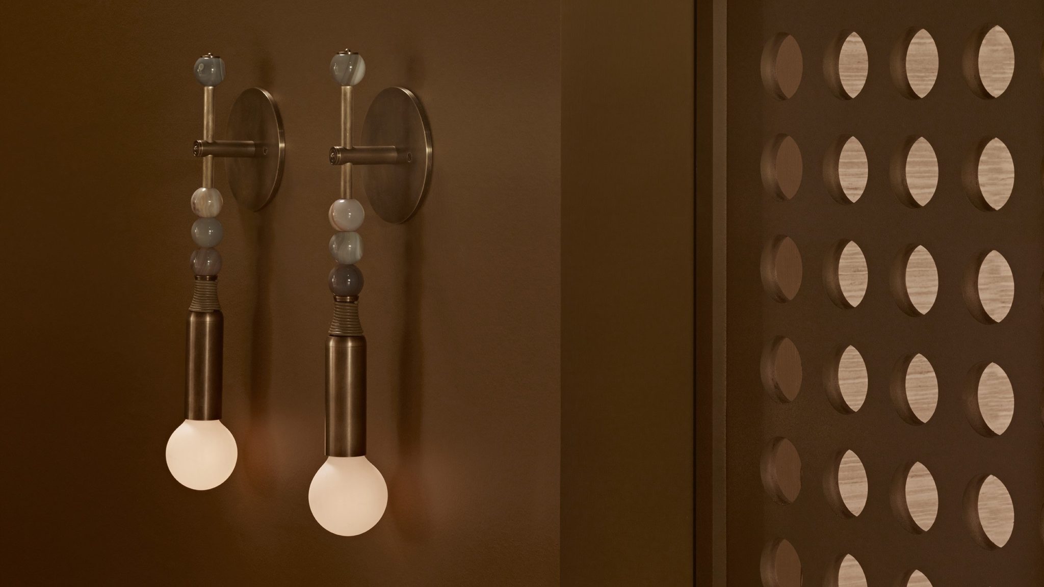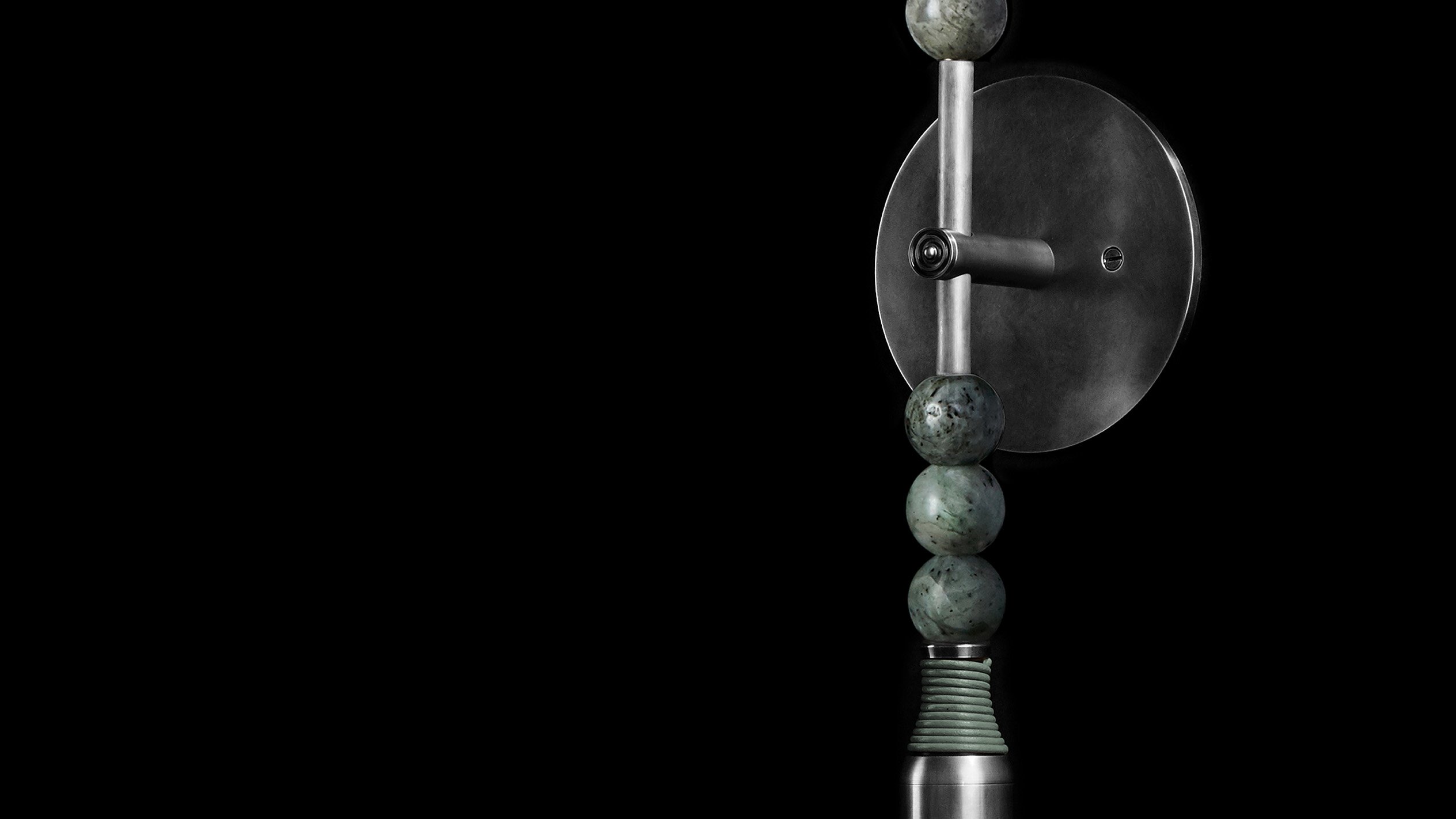 A strict arrangement of semi-precious stones recall fine details found on statues at the ancient city of Persepolis. Agate, Jasper or Jade beads are pierced by finely fluted pins, affixing them to a leather-bound brass structure. Customisation available