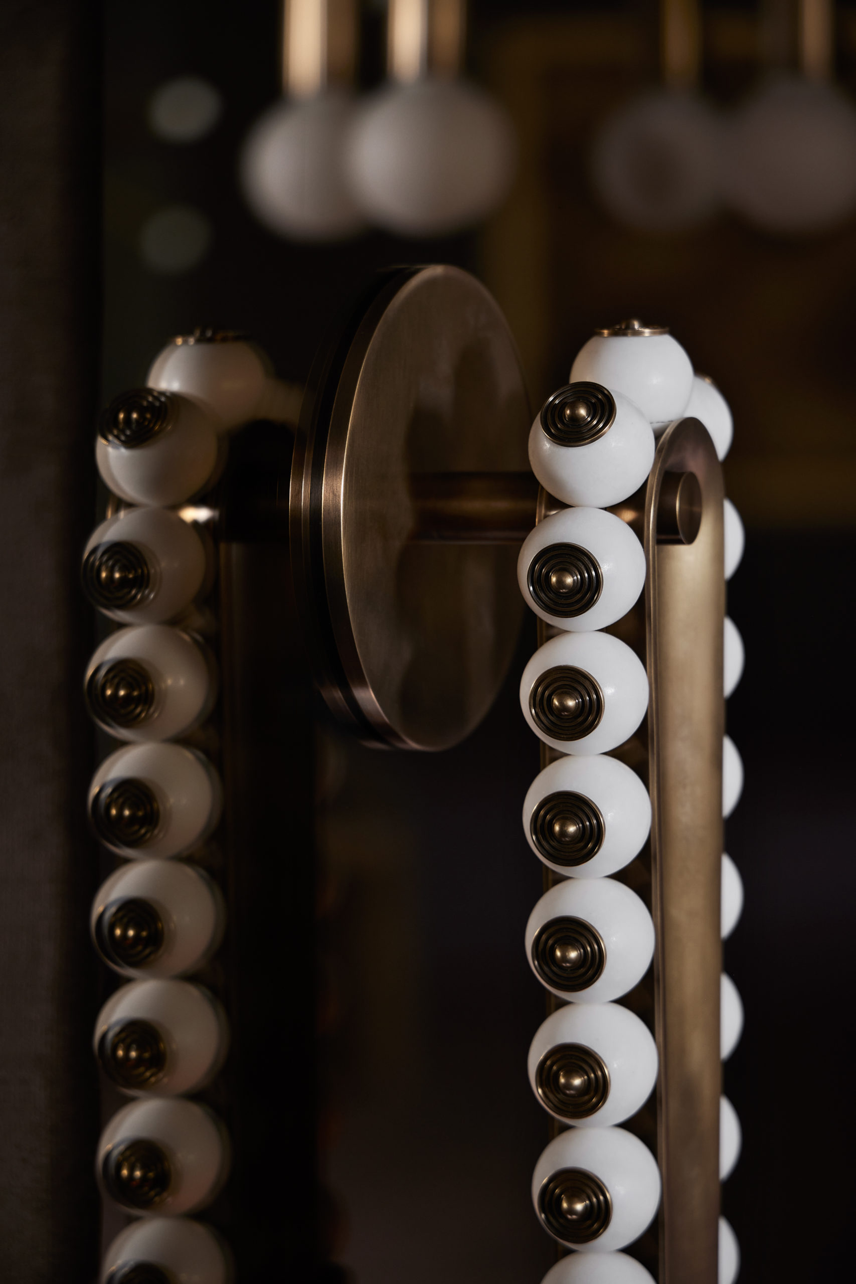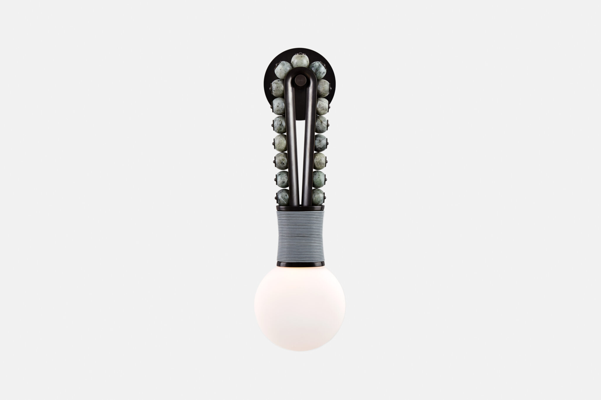 Collected since the introduction of ACT I|L in 2018, Our most eccentric agate beads premier as the first instillment of our APPARATUS edition, TALISMAN : LOOP SCONCE. The lustrous hand craved beads are set on fluted pins within a leather-bound brass frame, recalling the details that adorned statues in the ancient city of Persepolis. The unique hue and character of each stone is brought to life through mineral inclusions formed over millions of years. Customisation available