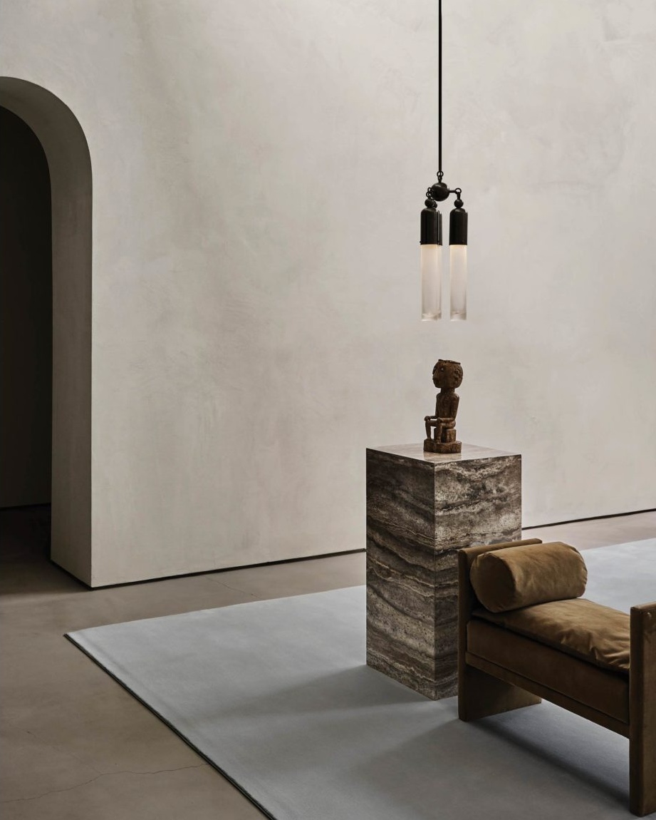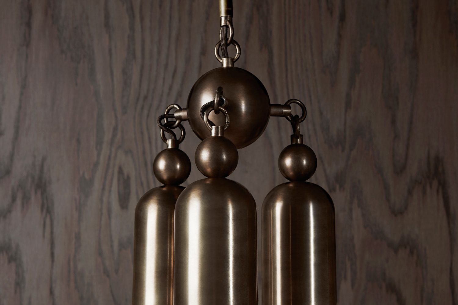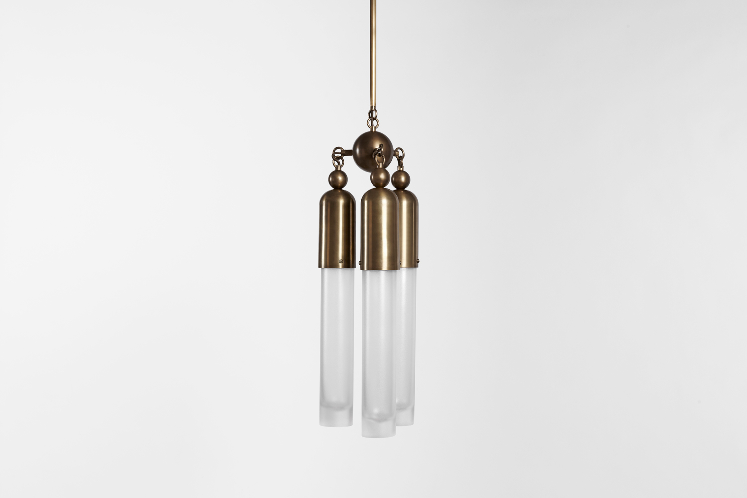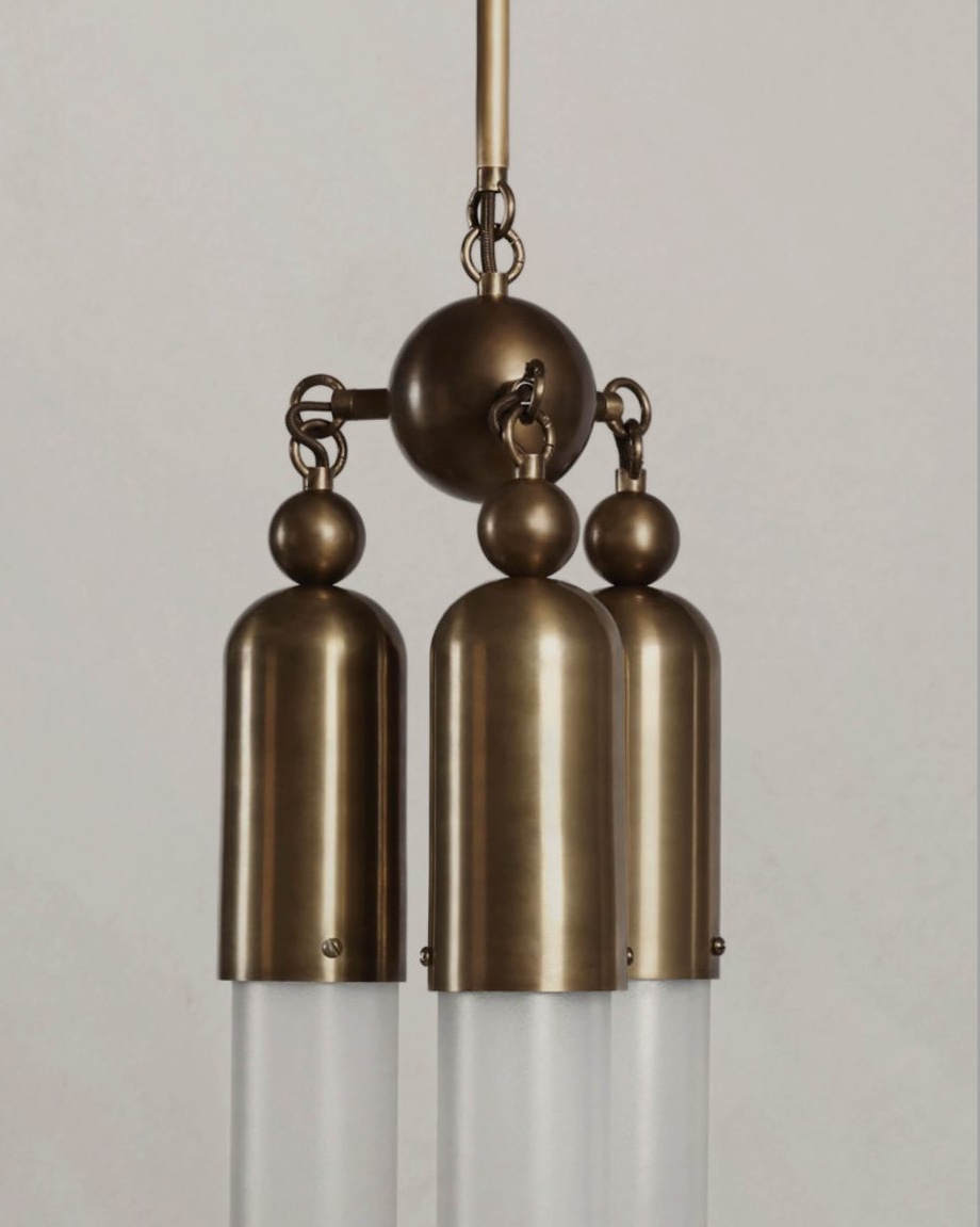 The Tassel series condenses the warmth and decadence of a traditional chandelier to a concise, modern conclusion. Emanating from a brass dome, the light is amplified as it refracts through mold-blown glass cylinders. Customisation available
