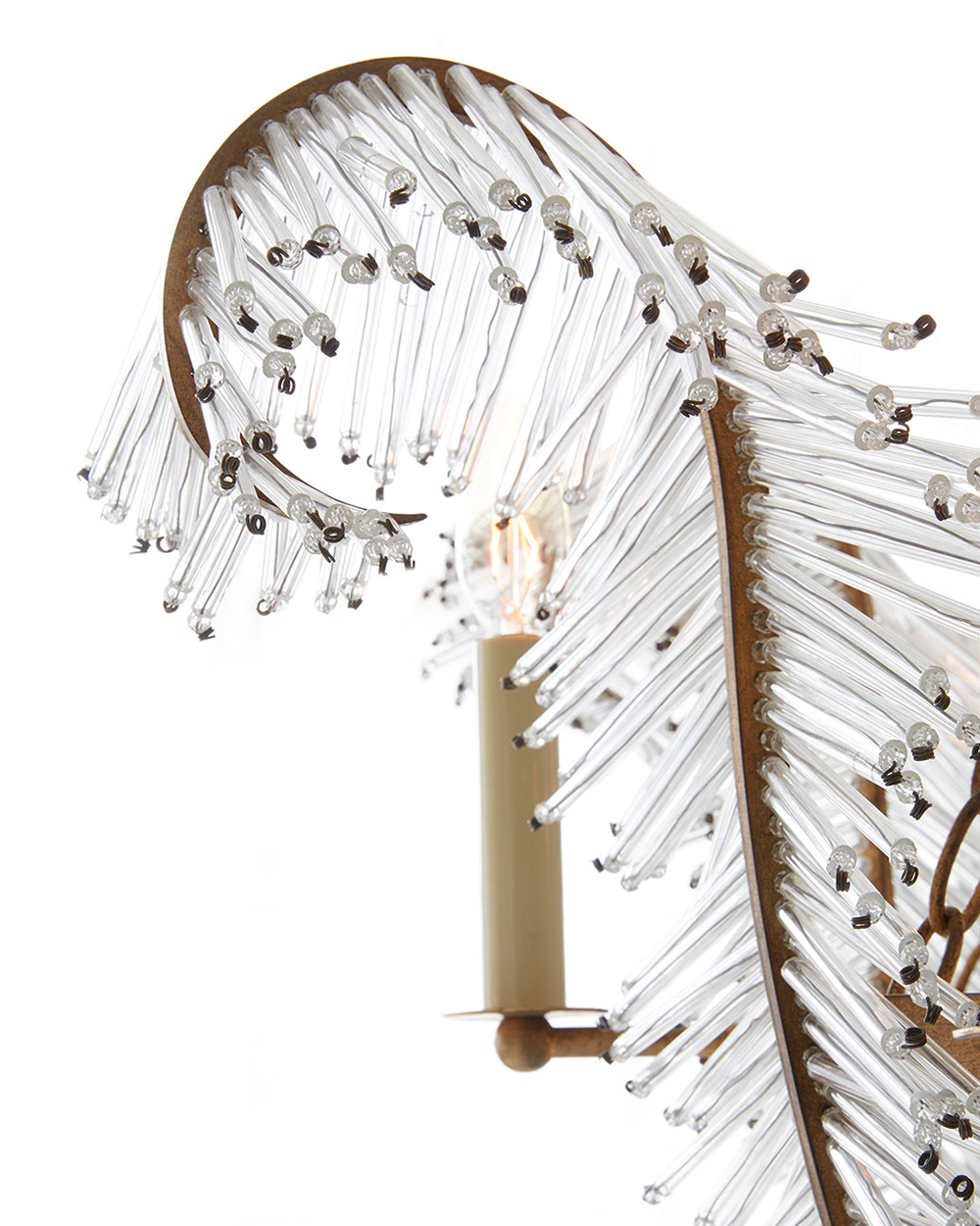 This gorgeous chandelier lends a tasteful look. The gold-finished frame supports six single candles surrounded by featherlike crystals to complete its ethereal nature. Customisation available