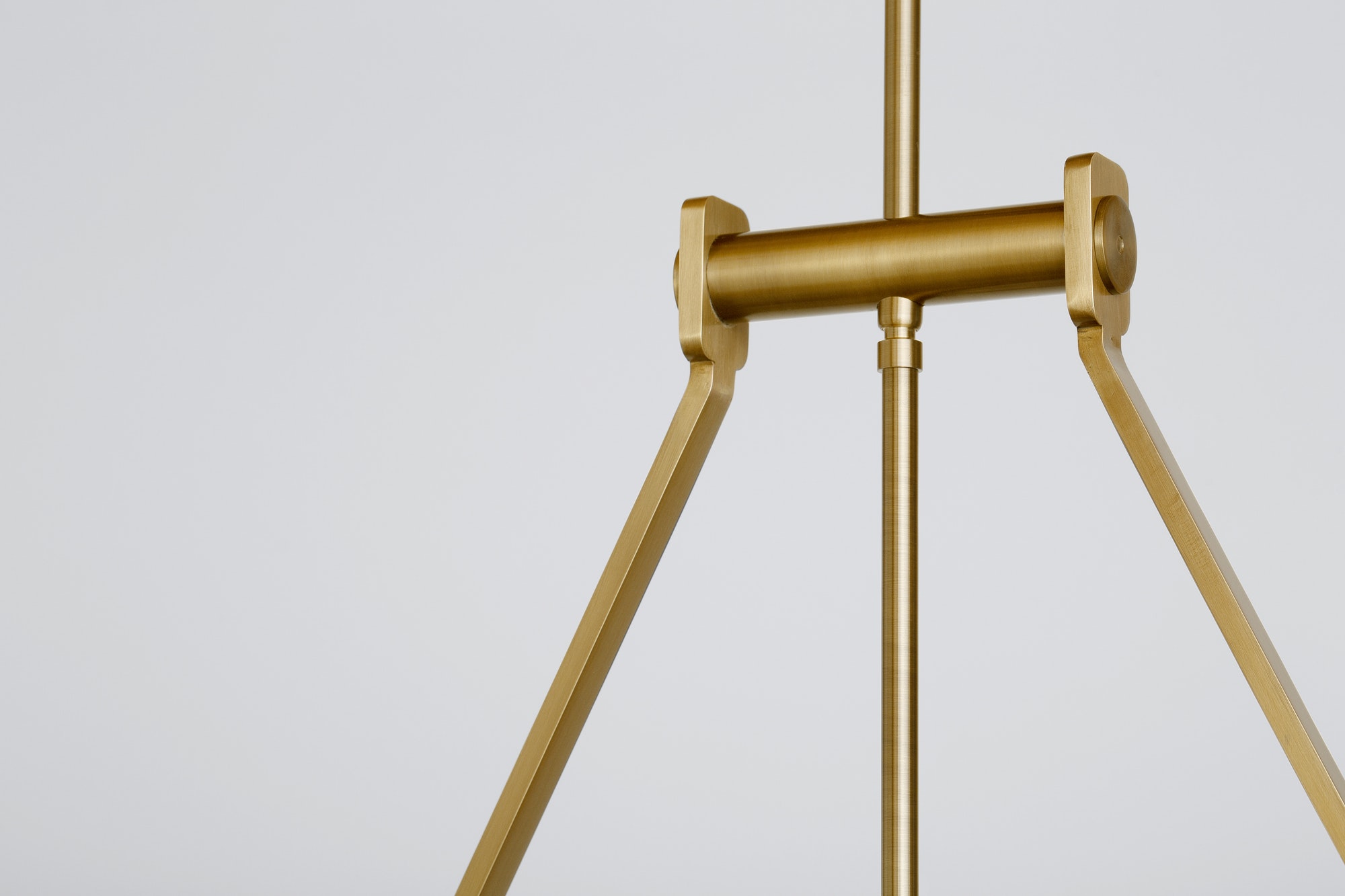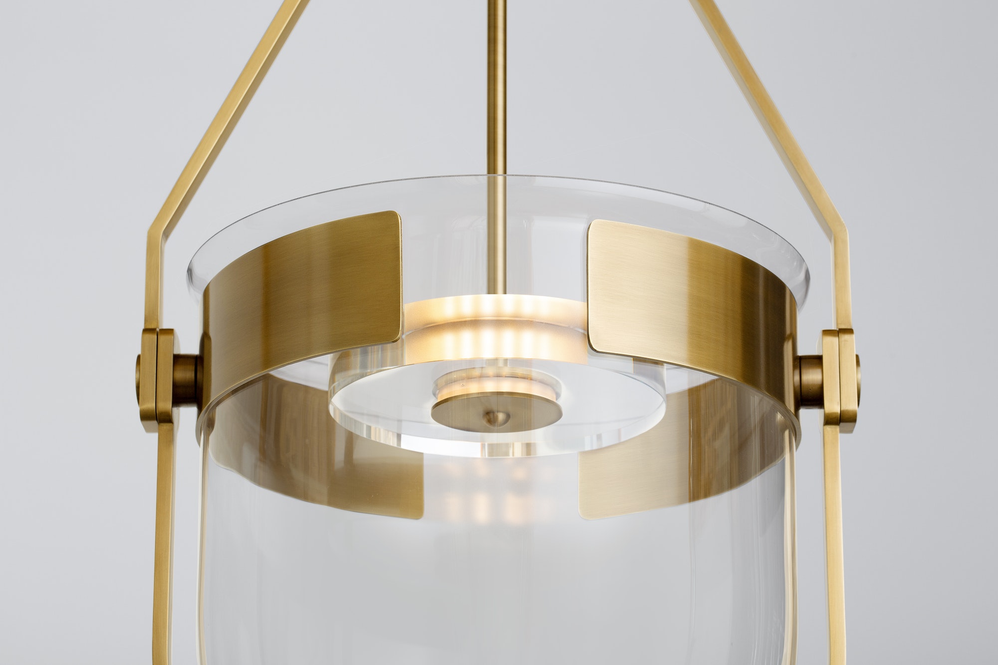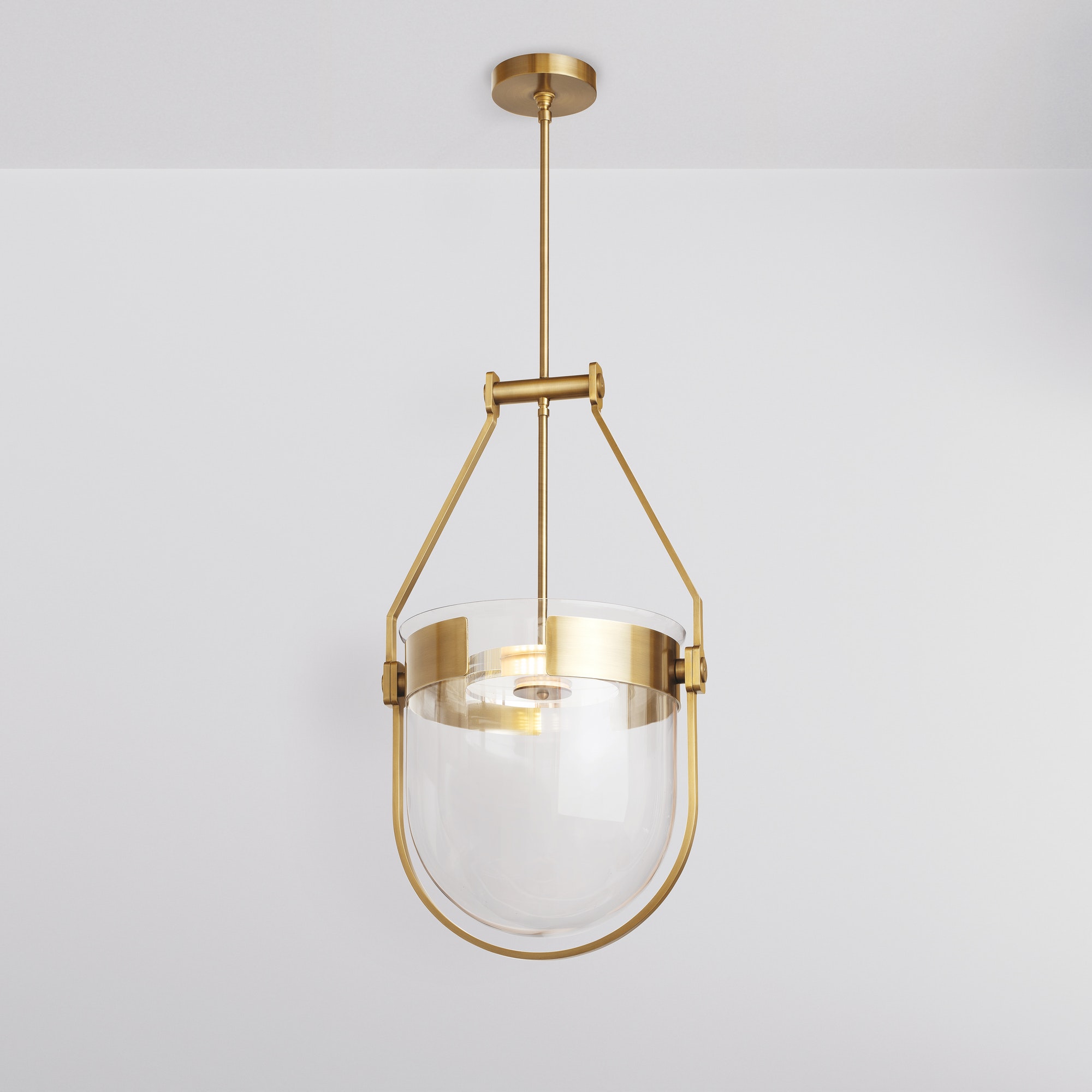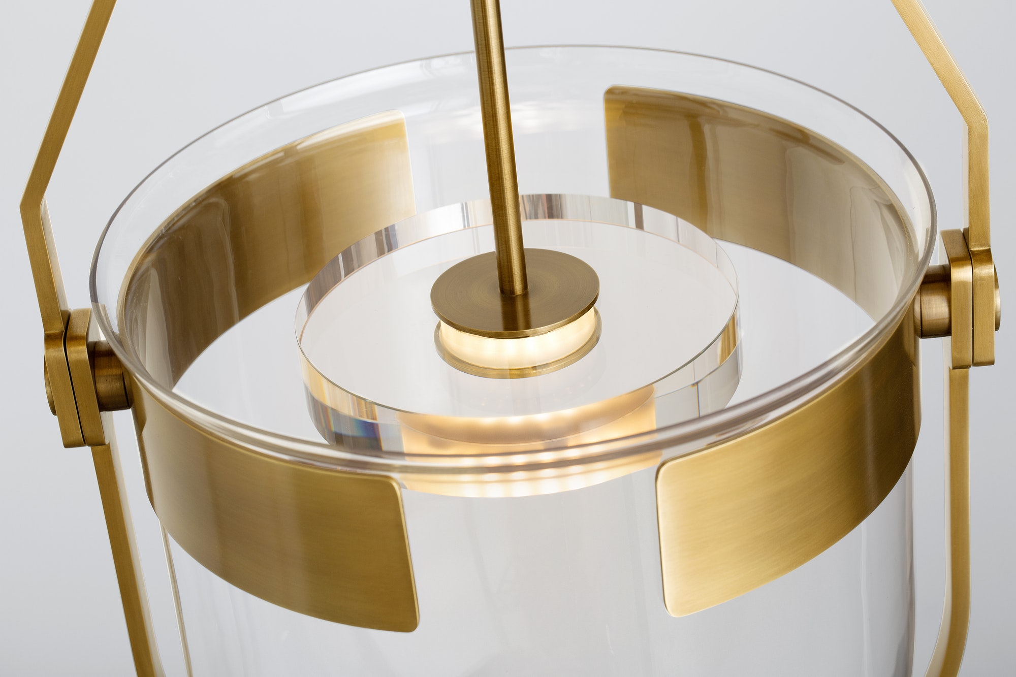 A hand blown glass bell jar is supported by two clasps while angled arms and a curved yoke suspend the fixture, creating a distinct silhouette. A solid glass disc with integrated LED illuminates the vessel with an inviting radiance. Shown in Brass. Customisation available
