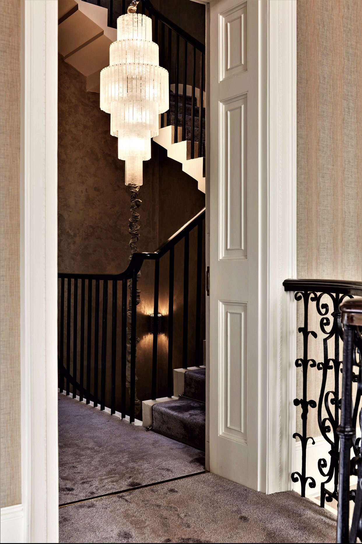 A very elegant chandelier of symetrical proportions - decorated with hand-carved Lucite tiles. Ideal for use in atriums and stairwells. Customisation available