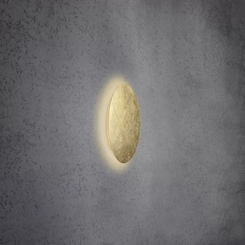 There is a LED ribbon which projects warm white light onto the wall behind the circular reflector of lacquered aluminium. The wall reflects the light back into the room. The result are magical light halos and atmospherical light ambiences. The Blade Open versions' reflector features an additional circular aperture through which the light shines even more intensely and generates additional striking graphic effects on the wall or ceiling. Customisation available