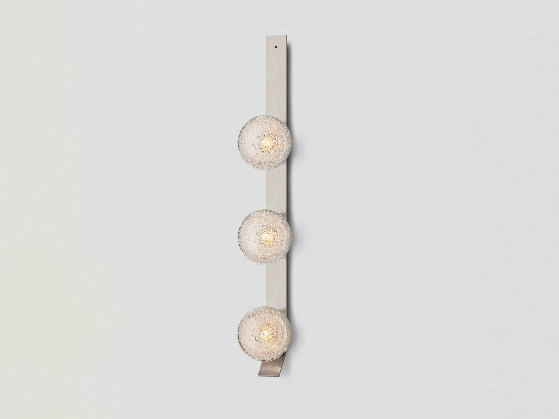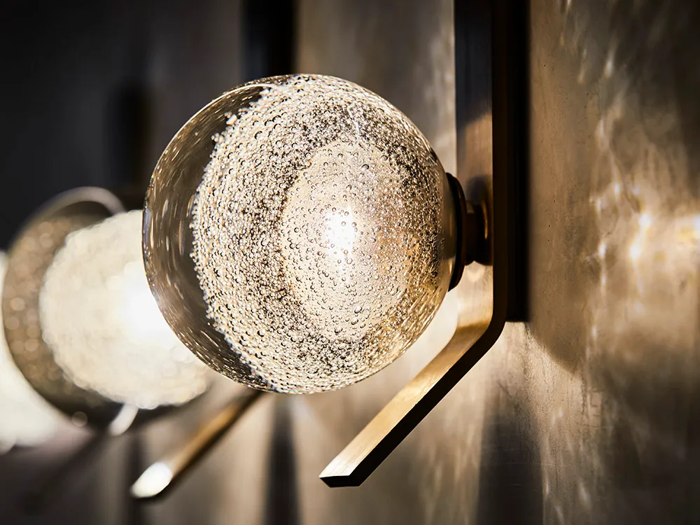 Effervescent yet luxuriously artisanal, Fizi is a celebration of the "The Art of Light". The Fizi ball seems to burst with tiny bubbles glinting below the surface. When lit, Fizi throws superb patterns and movement onto surrounding walls, reflecting the unique material identity of mouth blown glass. Customisation available.