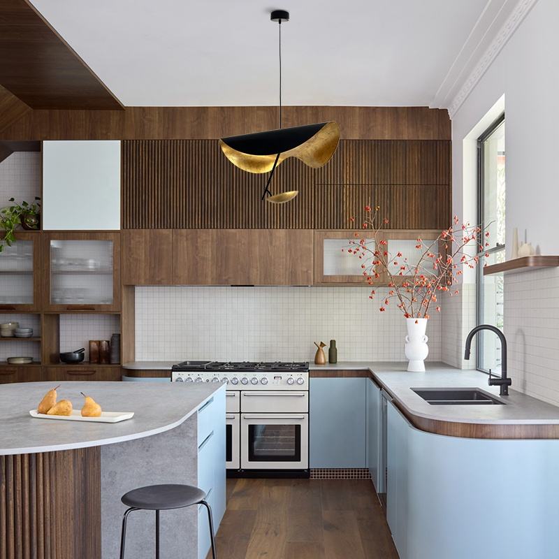 Lederam embodies the accuracy of the motion required to draw a line. The warm, softly coloured disks surround a LED module with an ultra-flat shape, which creates thin lamps and suspended forms with curved, sinuous lines. Customisation available