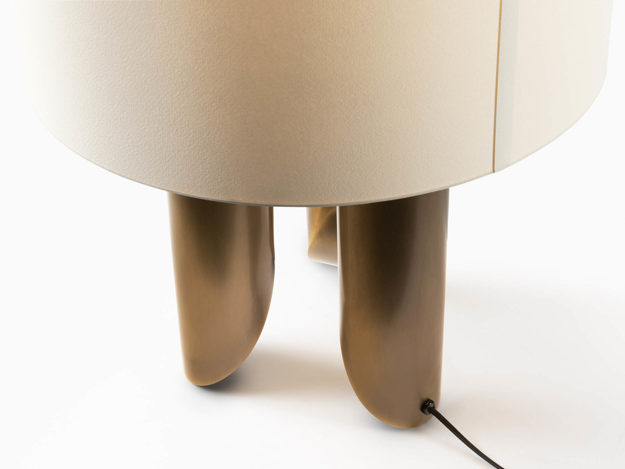 Three part brass base with French artist paper shade including diffuser. Light on its toes, the lamp’s three feet are finely welded with no visible seams. Customisation available