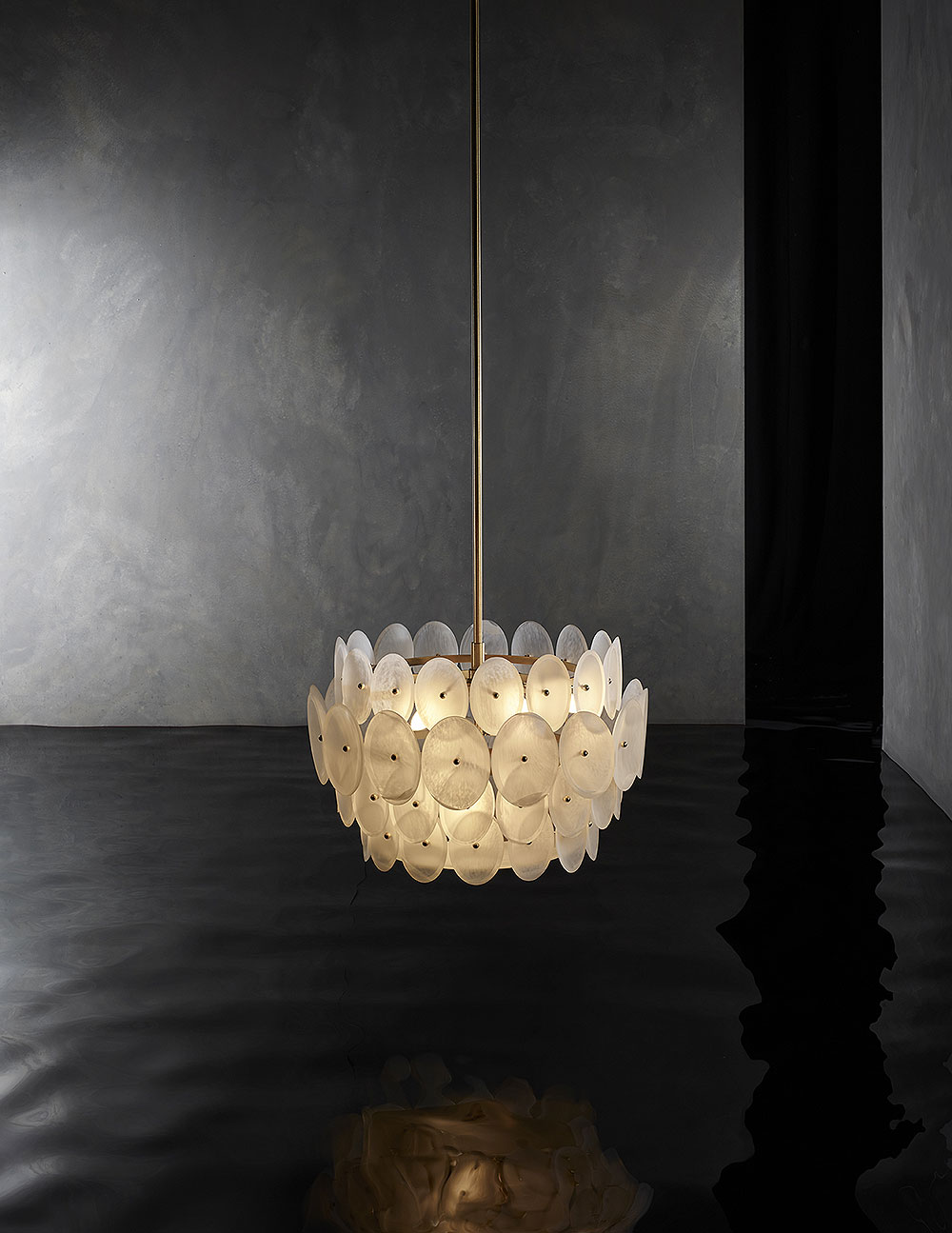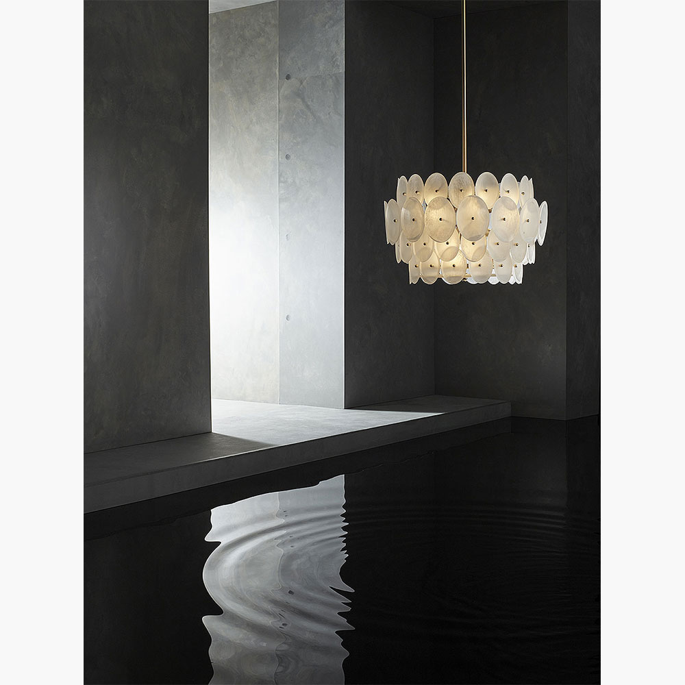 A cache of sixty-two pearlescent plates form this glowing crown of ultimate beauty and grandeur, each with a gold or silver bead nestled into its centre and a frosted glass diffuser to ensure elegance from every angle. The alabaster glass featured in this sophisticated chandelier is evocative of the natural nacre of the pearl oyster’s deep-sea treasure trove and emits an empyreal radiance when lit. Customisation available