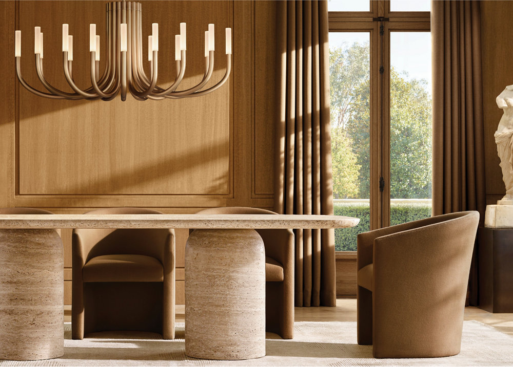 Inspired by minimalist midcentury Italian design, our contemporary interpretation of the chandelier offers reductionist form in a striking silhouette. Spare and understated, Rousseau's gracefully upraised arms hold aloft an etched glass shade fitted with an integrated LED bulb. When lit, the fixture emits a warm, filtered glow. Customisation available