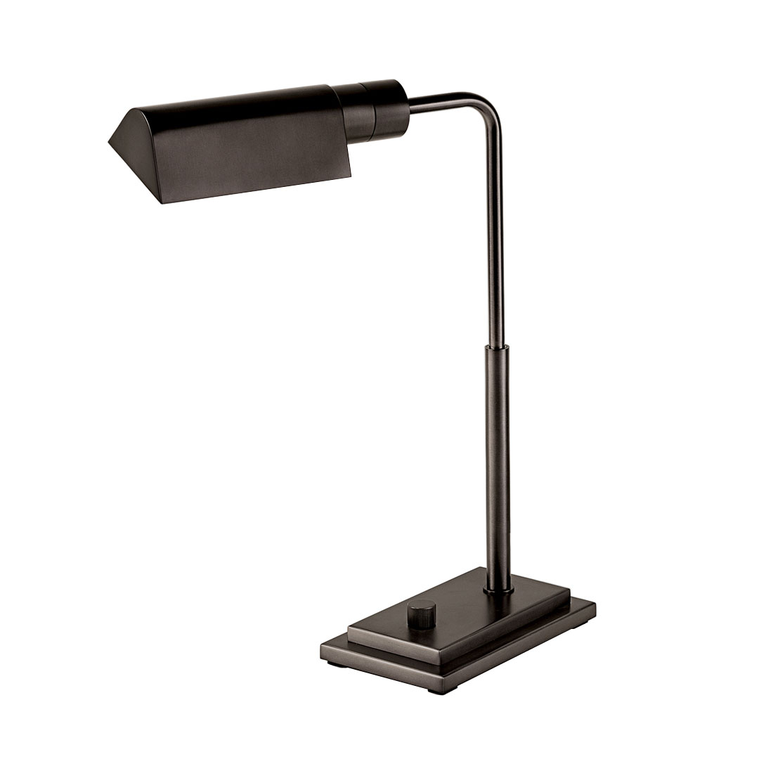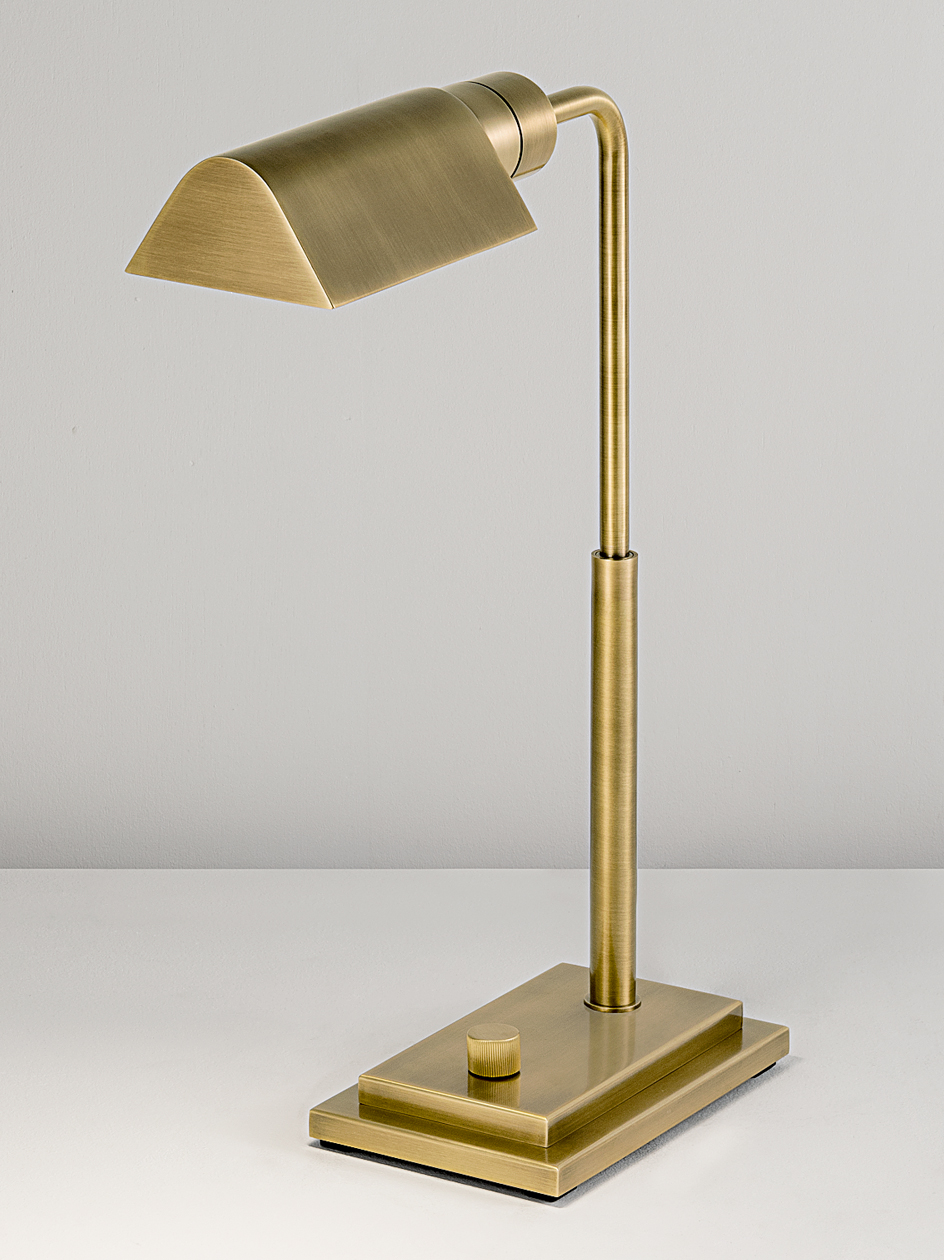 Rectangular stepped base, tubular column with triangular canopy and knurled rotary dimmer switch give a timeless style. Upright column swivels left/right. The canopy rotates to give a full range of directional light and has internal polished metal reflector for increased light output. Customisation available