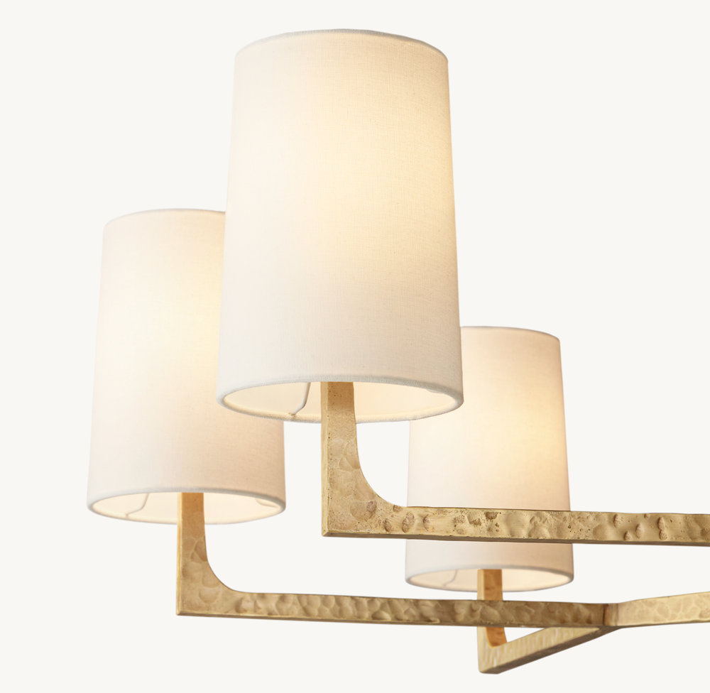 Spare and elegantly minimal, our fixture by Ian K. Fowler defines refined simplicity. A hand-forged, hammered metal frame – its arms perfectly tapered – showcases tailored white linen shades. An exercise in balance and proportion, it conjoins light and dark, crisp right angles and understated curves. Customisation available